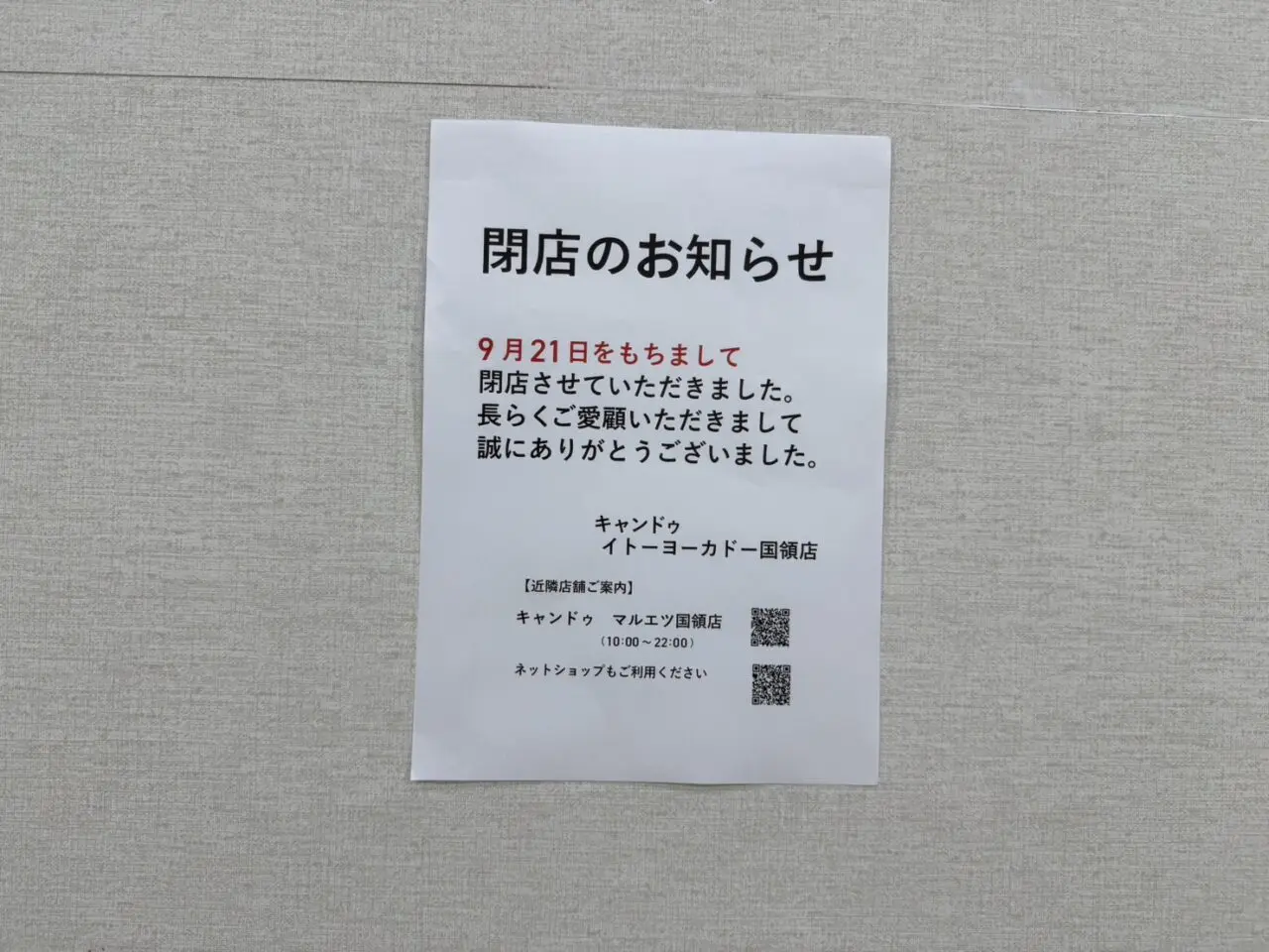 キャンドゥ イトーヨーカドー国領店は、長らく地域の皆様に愛されてきましたが、9月21日をもって閉店していました。