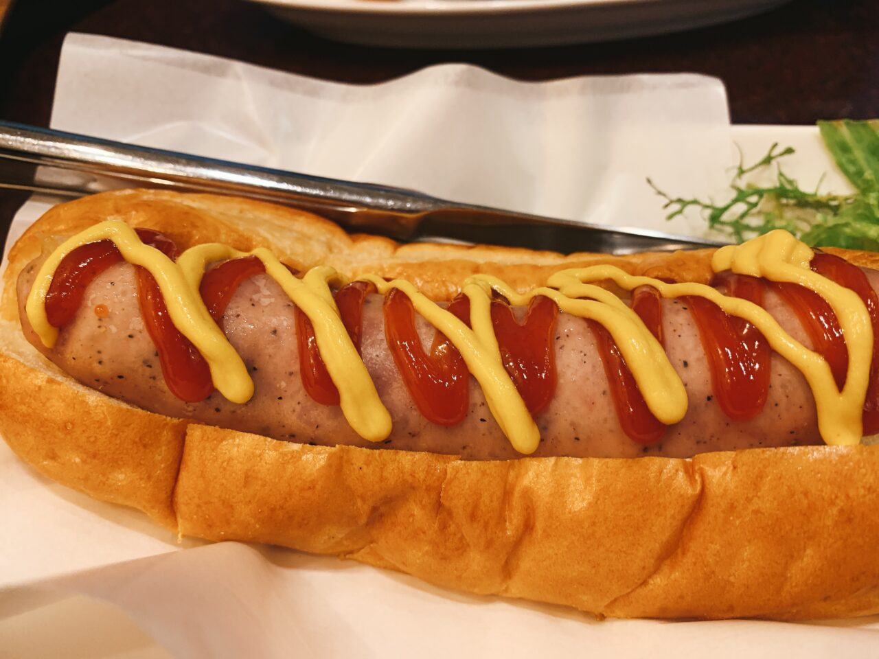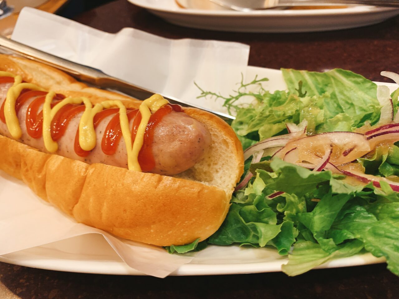 パンに挟まれたソーセージは、パリッとジューシーで食べ応え抜群! トッピングのケチャップとマスタードが利いており、一緒に添えられたシャキシャキのサラダも嬉しいポイントです。見た目以上のボリュームで、ランチとして大満足の一皿でした。