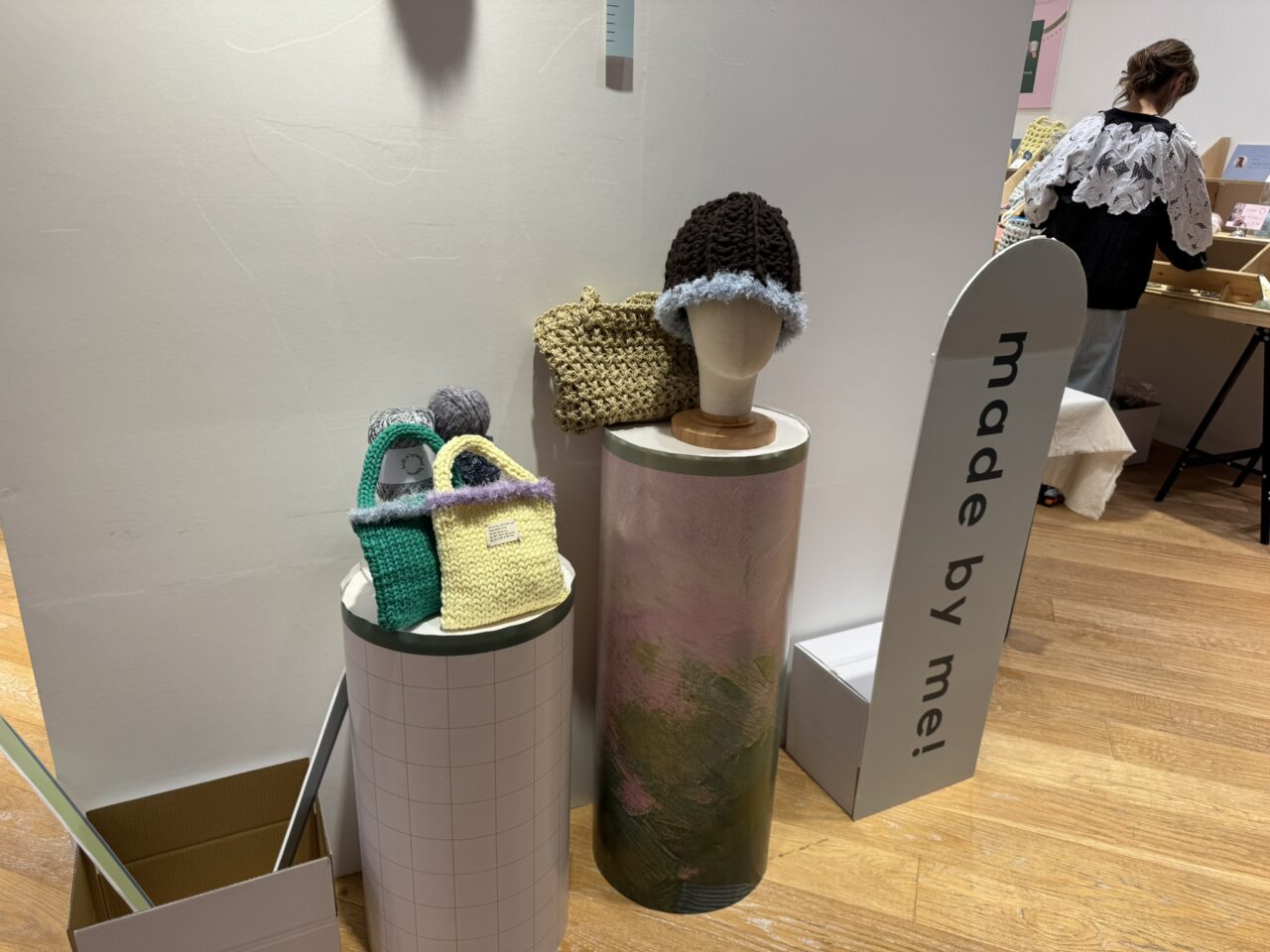 展示されていた手編みのバッグや帽子は、日本の毛糸ではあまり見かけないような鮮やかな色合いや、モコモコとした素材感が特徴的で、思わず立ち止まって見てしまいました。手芸好きの方々が熱心に糸を品定めしている様子が印象的でした。
