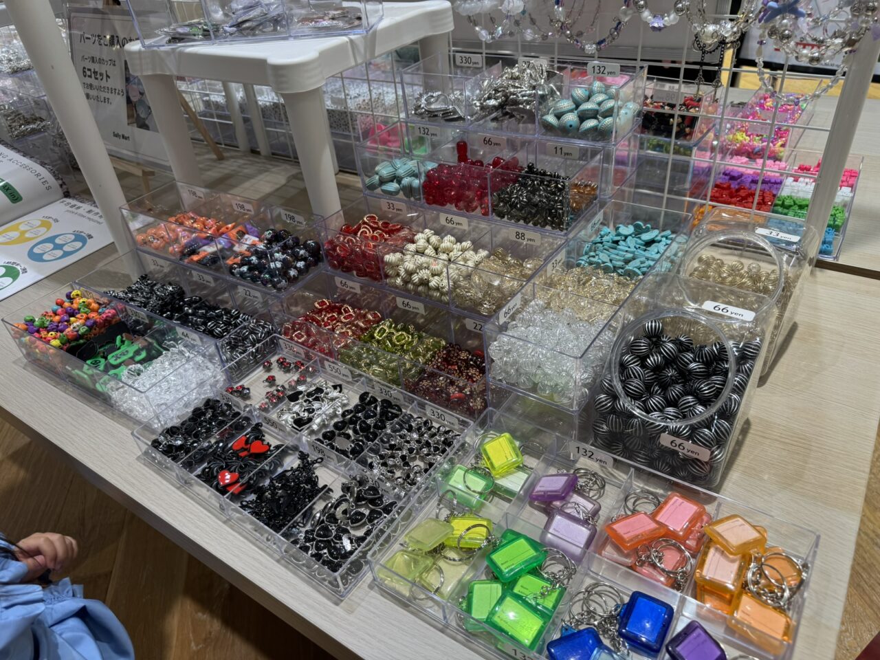 「ビーズ&アクセサリーパーツショップ Sally Mart」さんのブースは、特に親子連れで賑わっていました! 色とりどりのビーズやチャームがキラキラと並べられており、見ているだけでワクワクします。