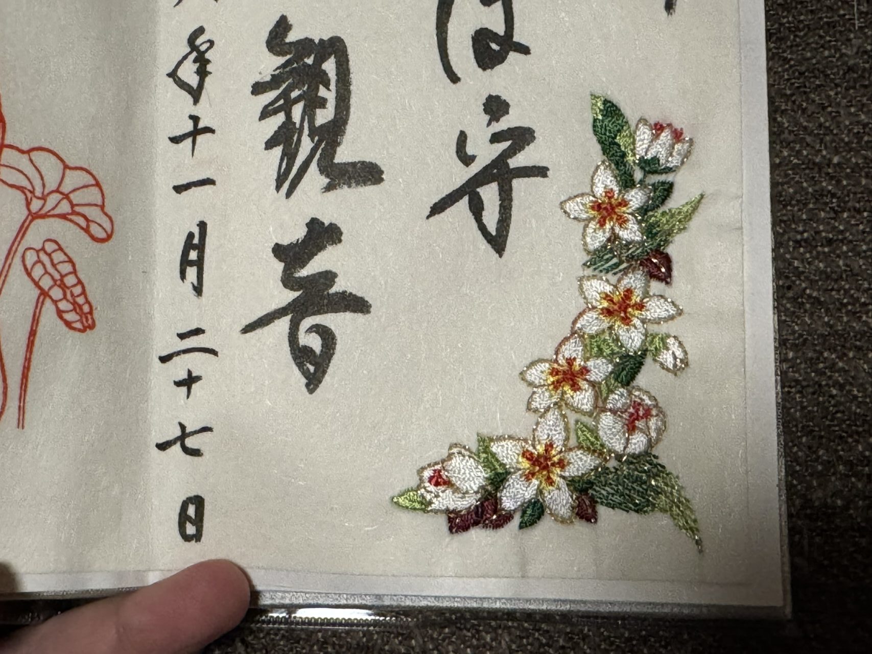 特徴: 御朱印の片隅には、深大寺の花をモチーフにした美しい刺繍が施されています。筆で書かれた文字と、立体的な刺繍の組み合わせが非常に華やかです。