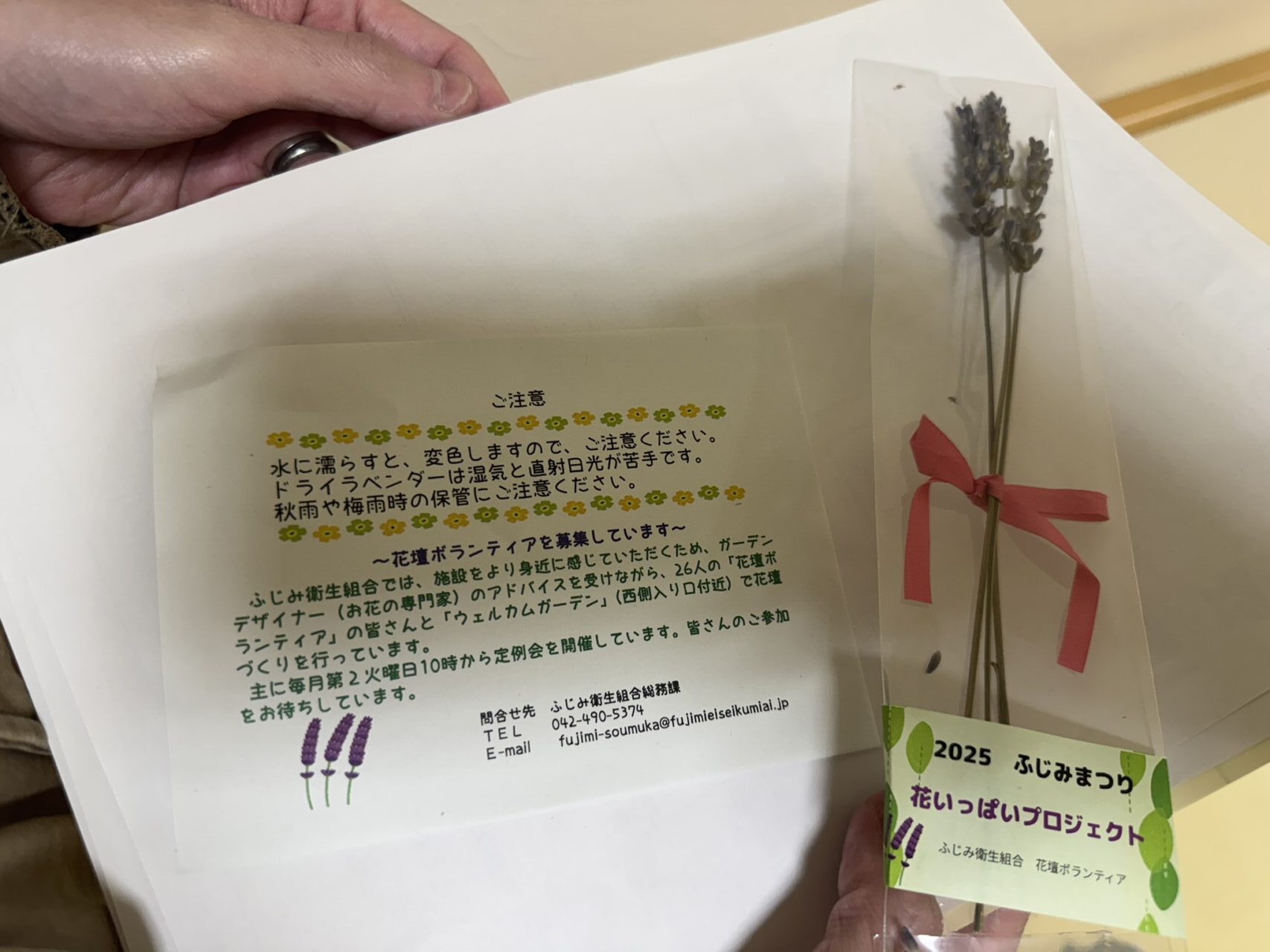 花いっぱいプロジェクト: ふじみ衛生組合の「花いっぱいプロジェクト」では、乾燥ラベンダーのプレゼント企画も行われていました。
