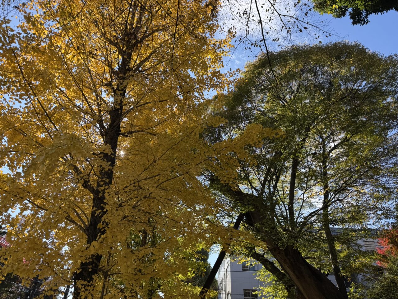 青空を背景に、イチョウの葉全体がまばゆいばかりの黄金色に色づき、太陽の光を浴びてキラキラと輝いている姿に感動しました!