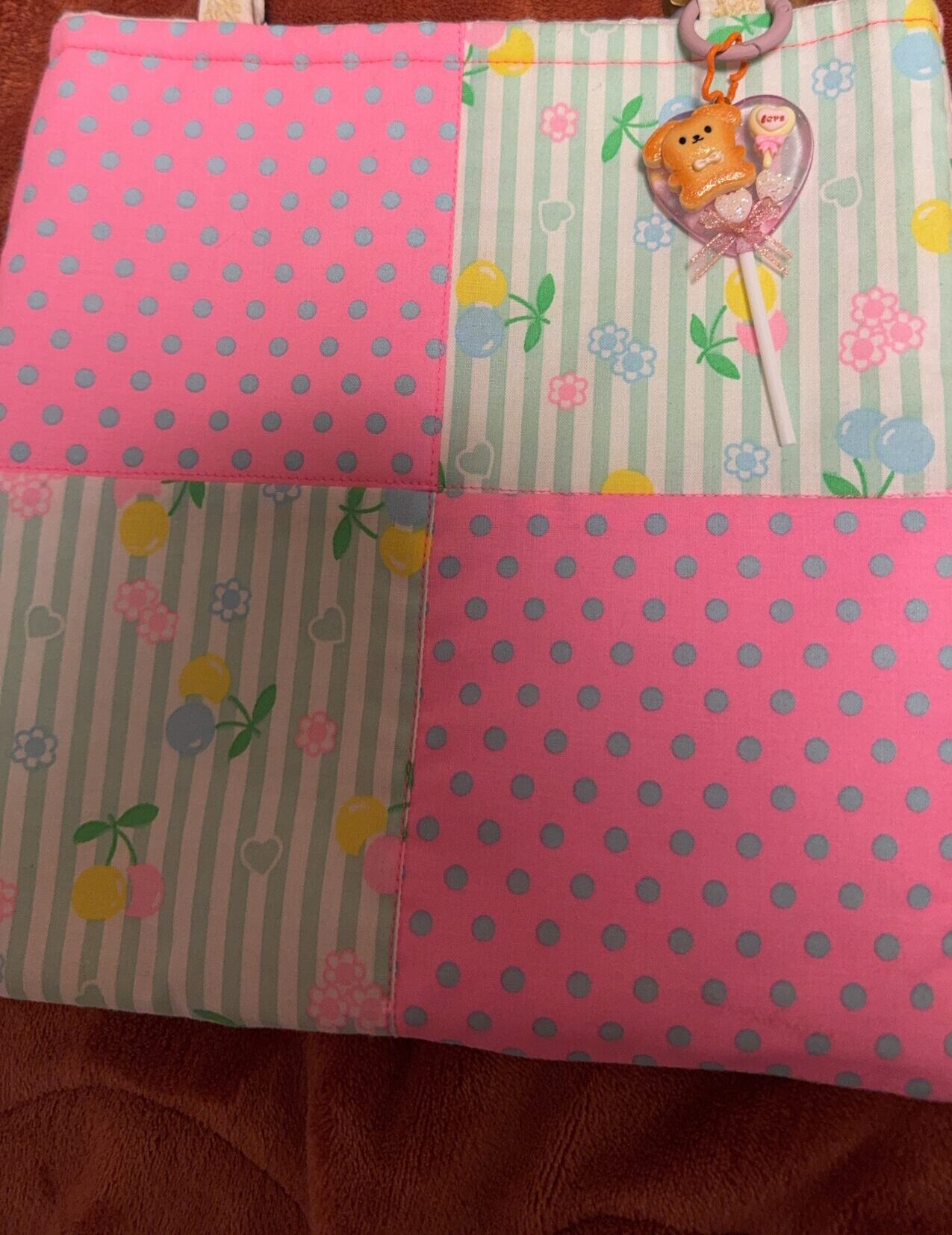 パステルカラーのドットやチェリー柄、そしてレトロなフラワー柄が組み合わされた、パッチワークデザインのバッグです。 持ち手には繊細な刺繍テープがあしらわれていて、細部まで作家さんのこだわりが感じられます。