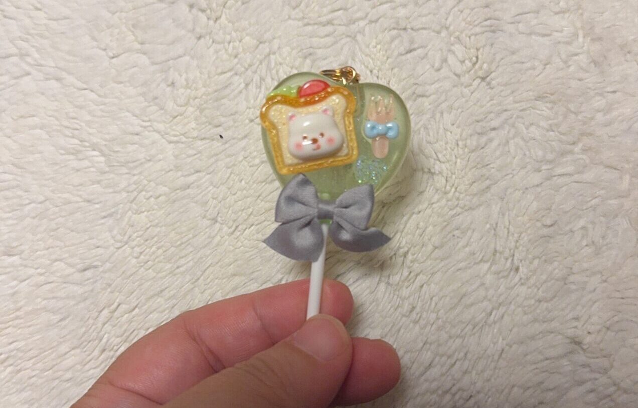 バッグに合わせて選んだのは、ハート型のロリポップキャンディのようなチャーム。 中には食パンを大事そうに抱えた小さなクマさんが閉じ込められていて、見るたびに癒やされます。 リボンやフォークのモチーフも付いていて、バッグの可愛さをさらに引き立ててくれます。