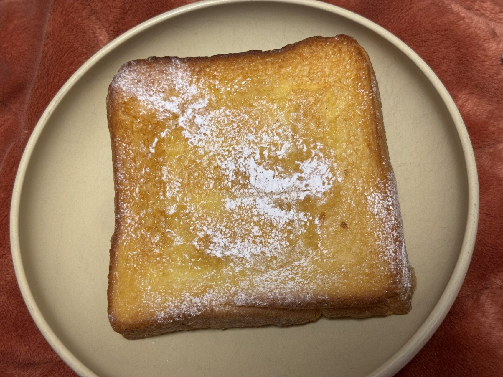 厚切りの食パンにアパレイユがしっかり染み込み、表面には粉雪のようなシュガーが。口に入れるとじゅわっと甘みが広がり、耳まで柔らかくて至福のひとときです。