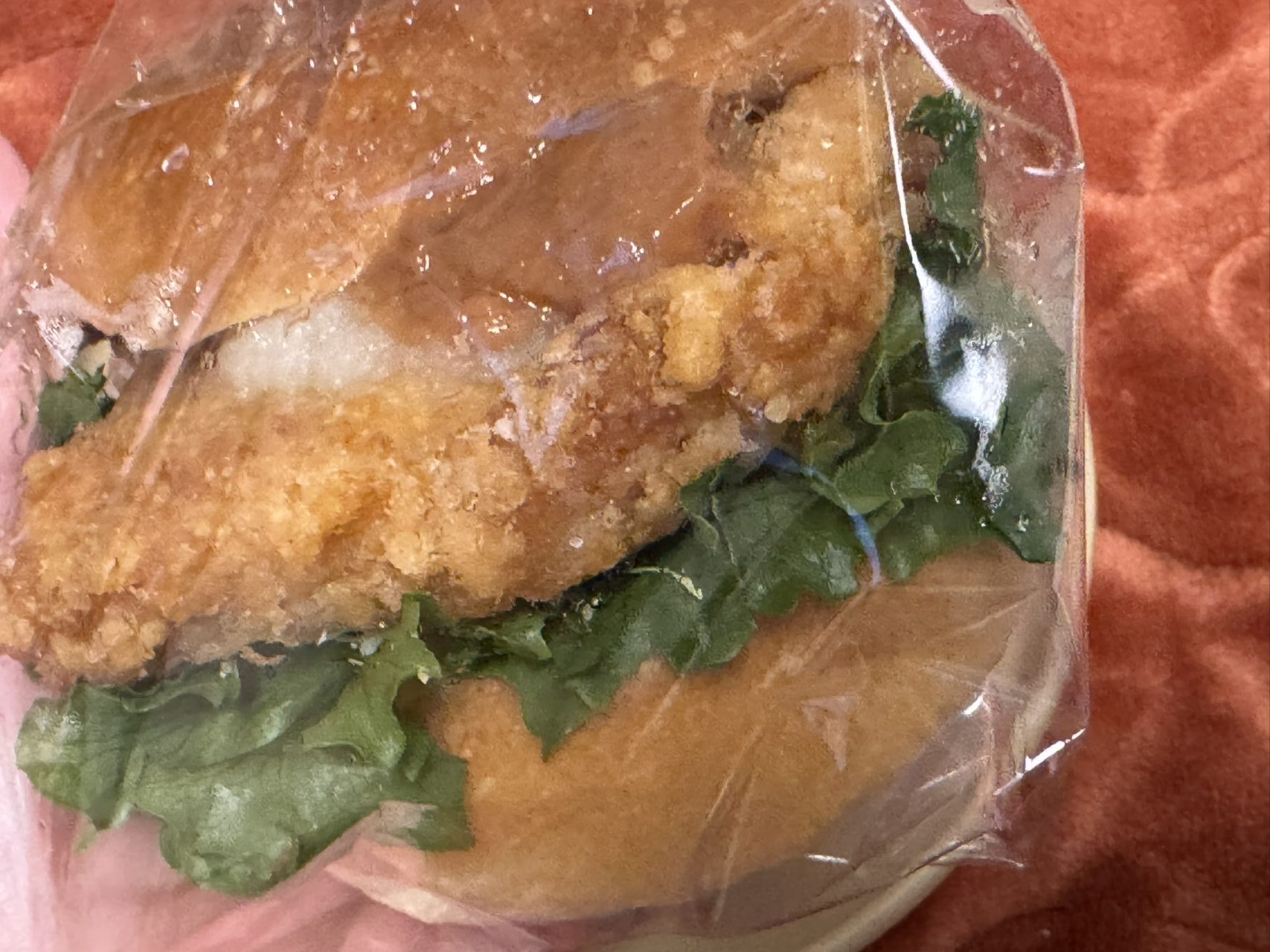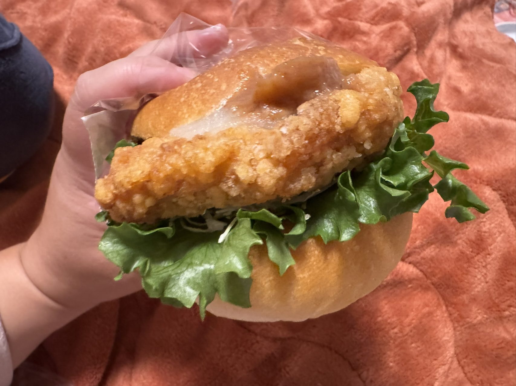 バンズからはみ出すほど大きなチキンタツタがサンドされています。サクサクの衣とシャキシャキのレタス、そしてふんわりしたバンズのバランスが絶妙で、食べ応え抜群です。