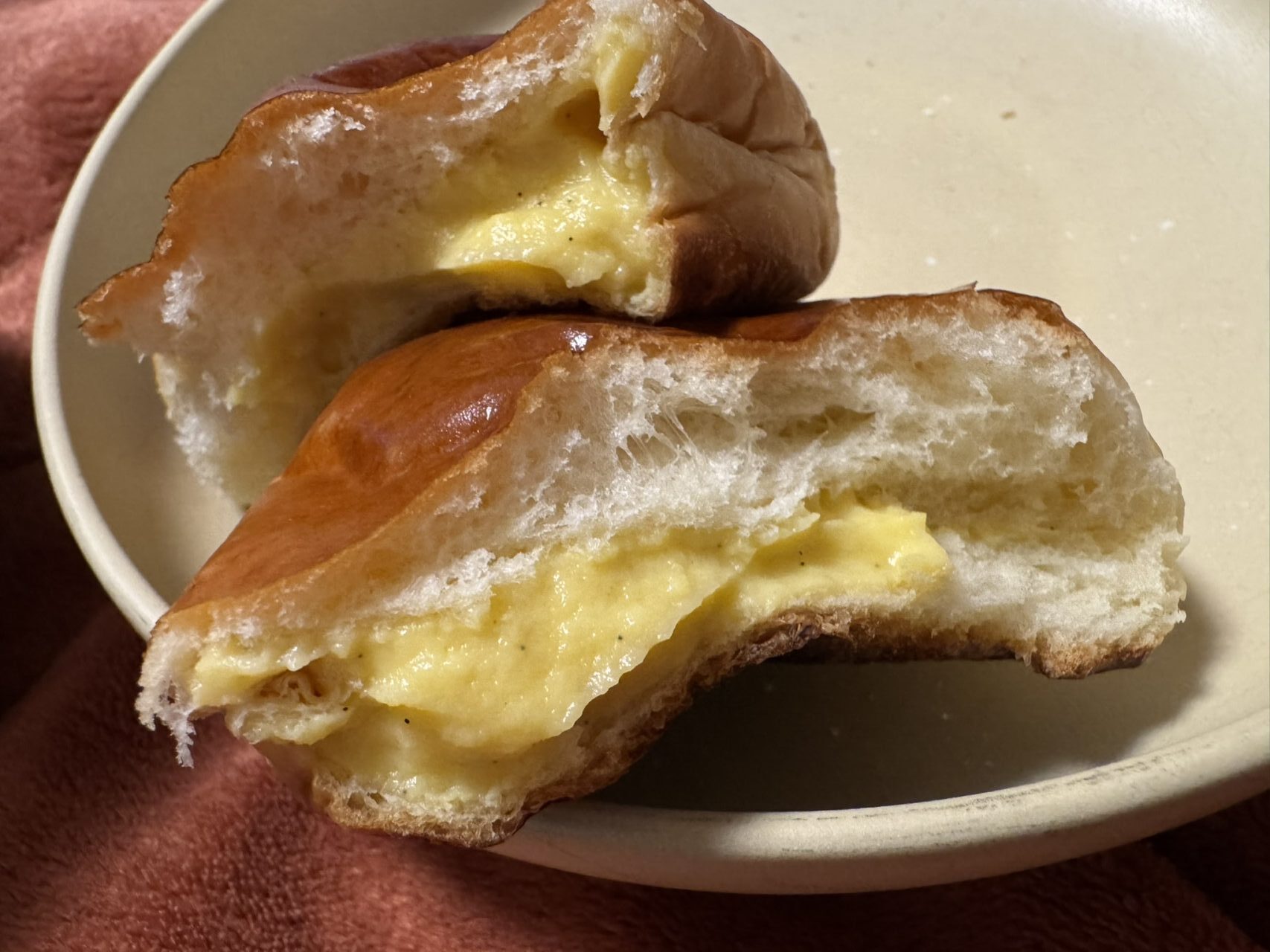 手に取るとずっしり重みを感じるクリームパン。中にはバニラビーンズが香る、ぽってりと濃厚な自家製カスタードクリームがこれでもかというほど詰まっています。