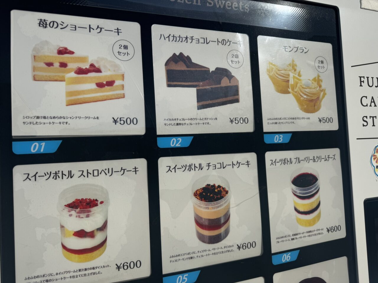 自販機では、冷凍のまま持ち帰って好きな時に解凍して食べられるスイーツが豊富に揃っています。