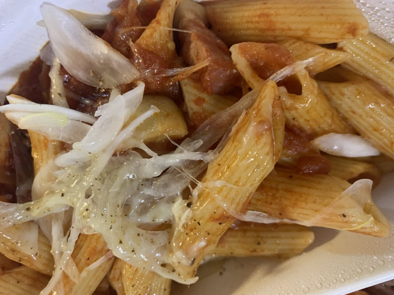 パスタ(アマトリチャーナ): ペンネを使用したアマトリチャーナは、ベーコンの旨みとトマトソースのコクが絶妙。たっぷりの新たまねぎとチーズがとろりと絡み、食べ応え抜群です。