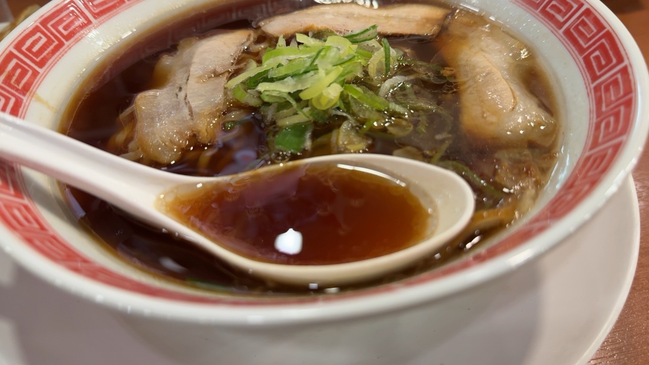 幸楽苑の本社がある福島県郡山市のご当地ラーメンとして愛される「郡山ブラック」。丼が運ばれてきた瞬間、まずそのスープの「黒さ」に圧倒されます。