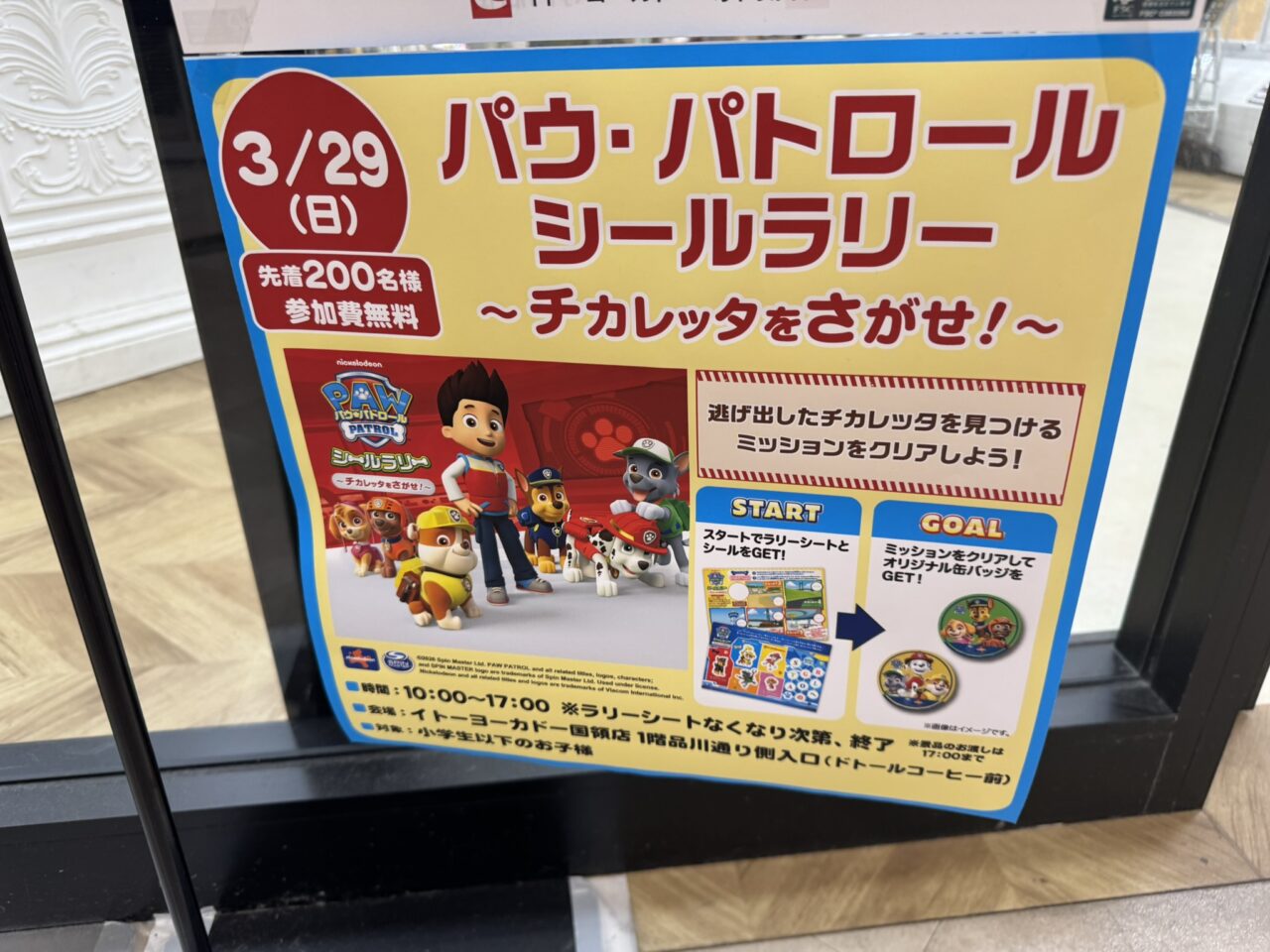 【調布市】3月29日にイトーヨーカドー国領店で「パウ・パトロール シールラリー」開催!先着200名、参加無料で缶バッジがもらえます