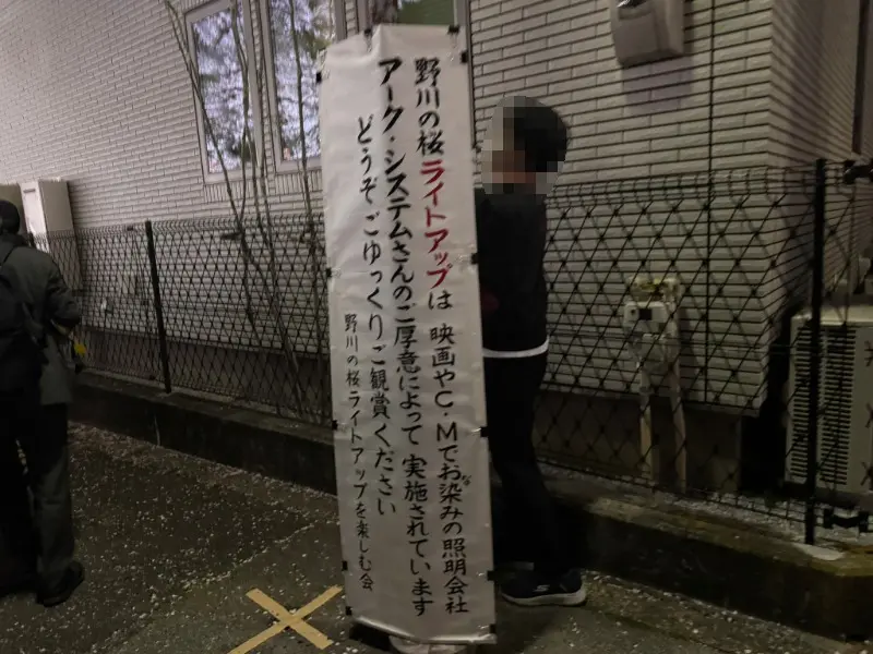 このイベントは、照明会社アーク・システムが地域への感謝を込めて実施しているもので、1本の桜を従業員向けに照らしたことから始まった取り組みが、今では多くの人が訪れる地域の風物詩となっています。
